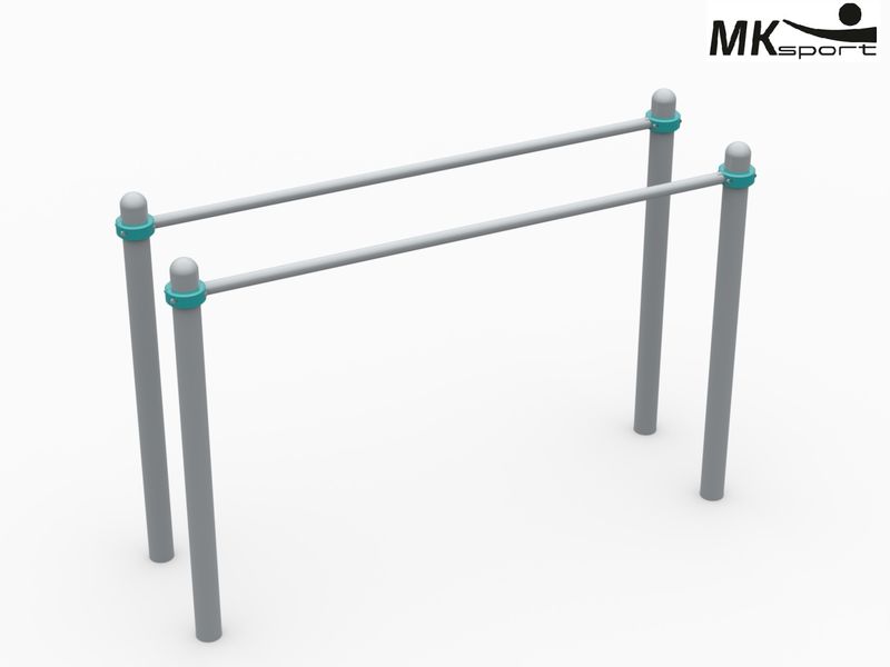Параллельные брусья – универсальный снаряд для проработки трицепсов, мышц груди и плечевого пояса. На брусьях можно выполнять не только стандартные отжимания, но и упрощенные подтягивания, планку, подъем ног, а также растяжку и разминку. Брусья выполнены из стальных труб 42*3 мм и закреплены на основных столбах с помощью стальных хомутов. Опоры изготовлены из труб 89*3 мм. Длина снаряда – 2 м. Стандартный цвет оборудования серый, хомуты бирюзовые.